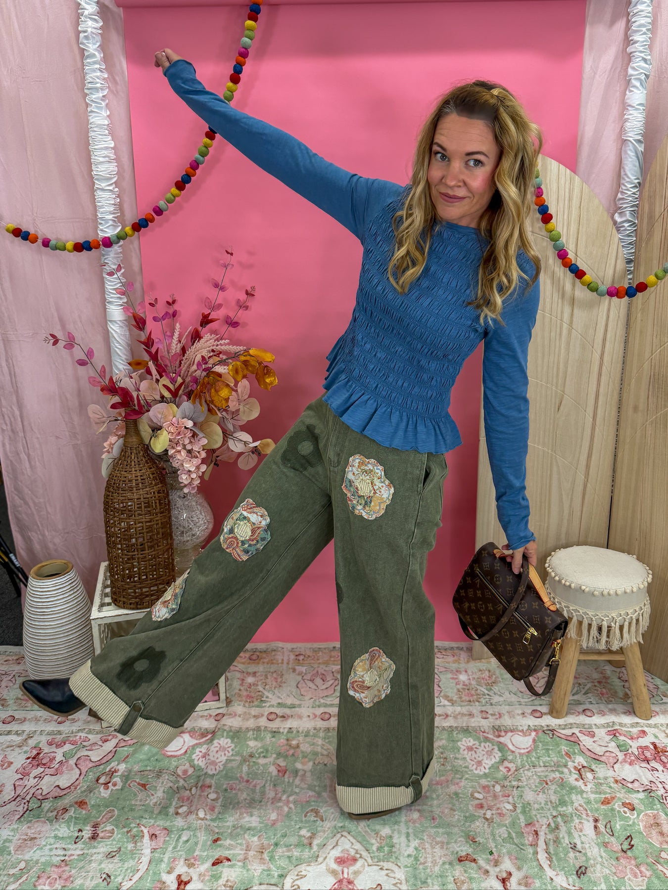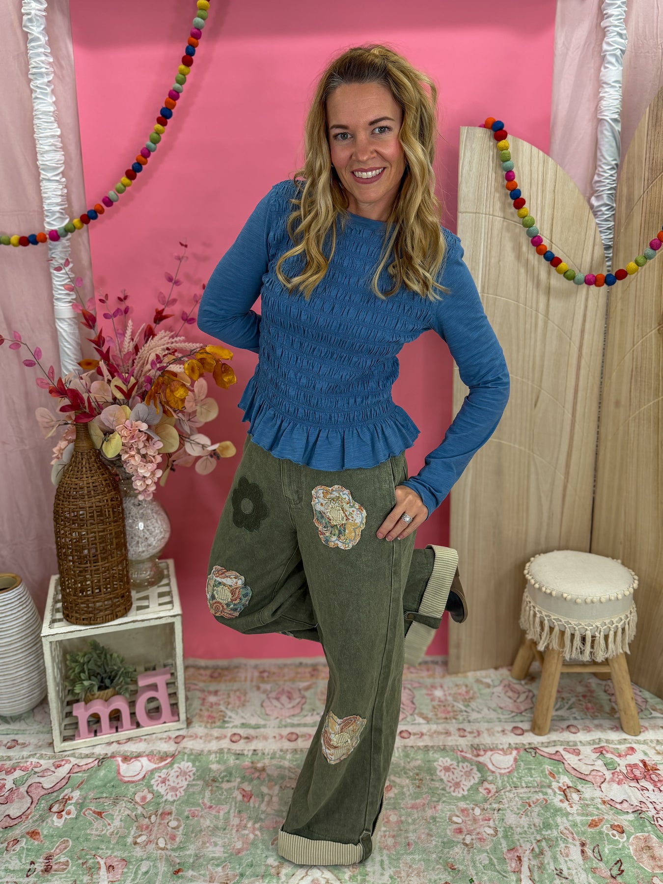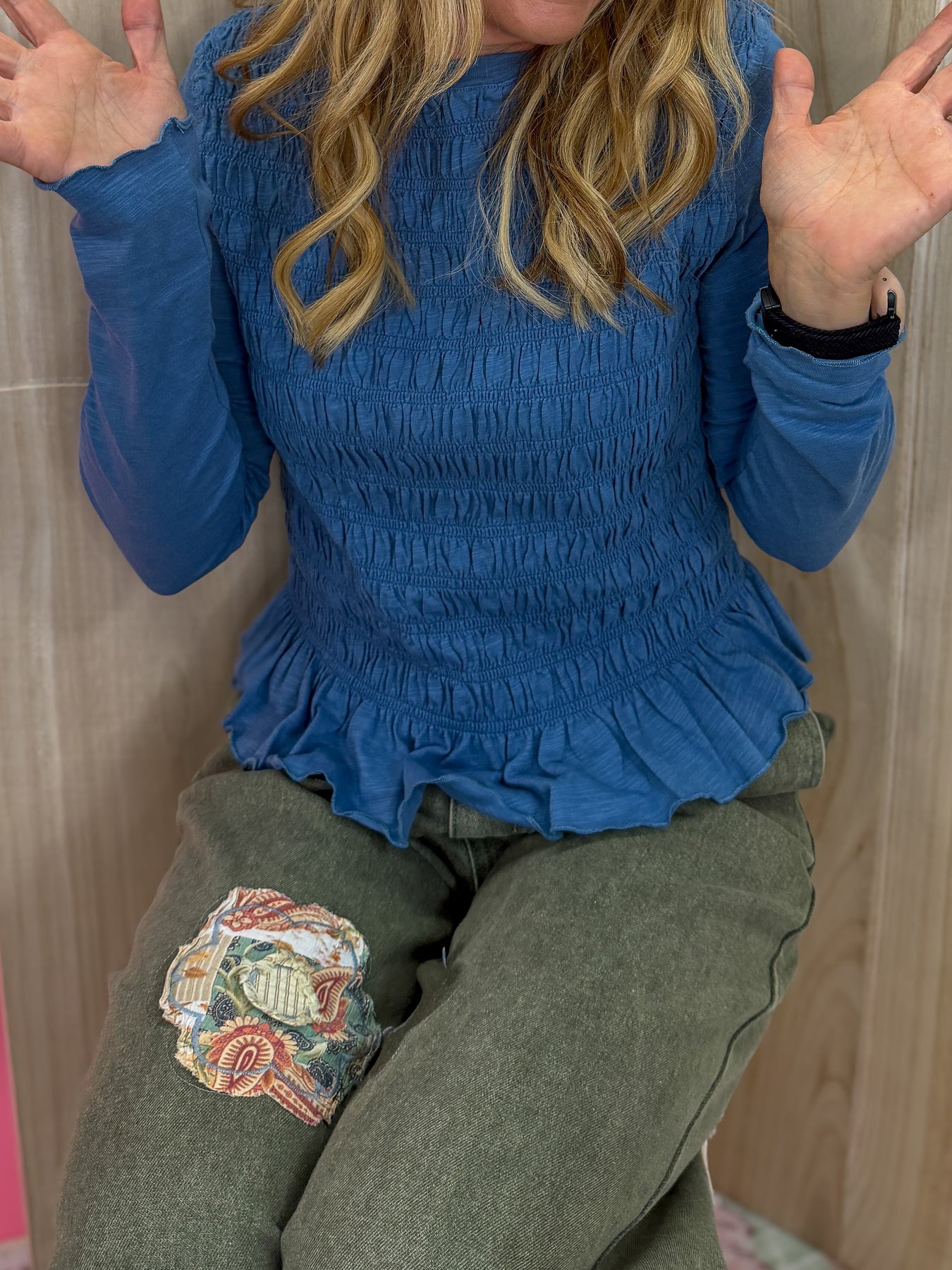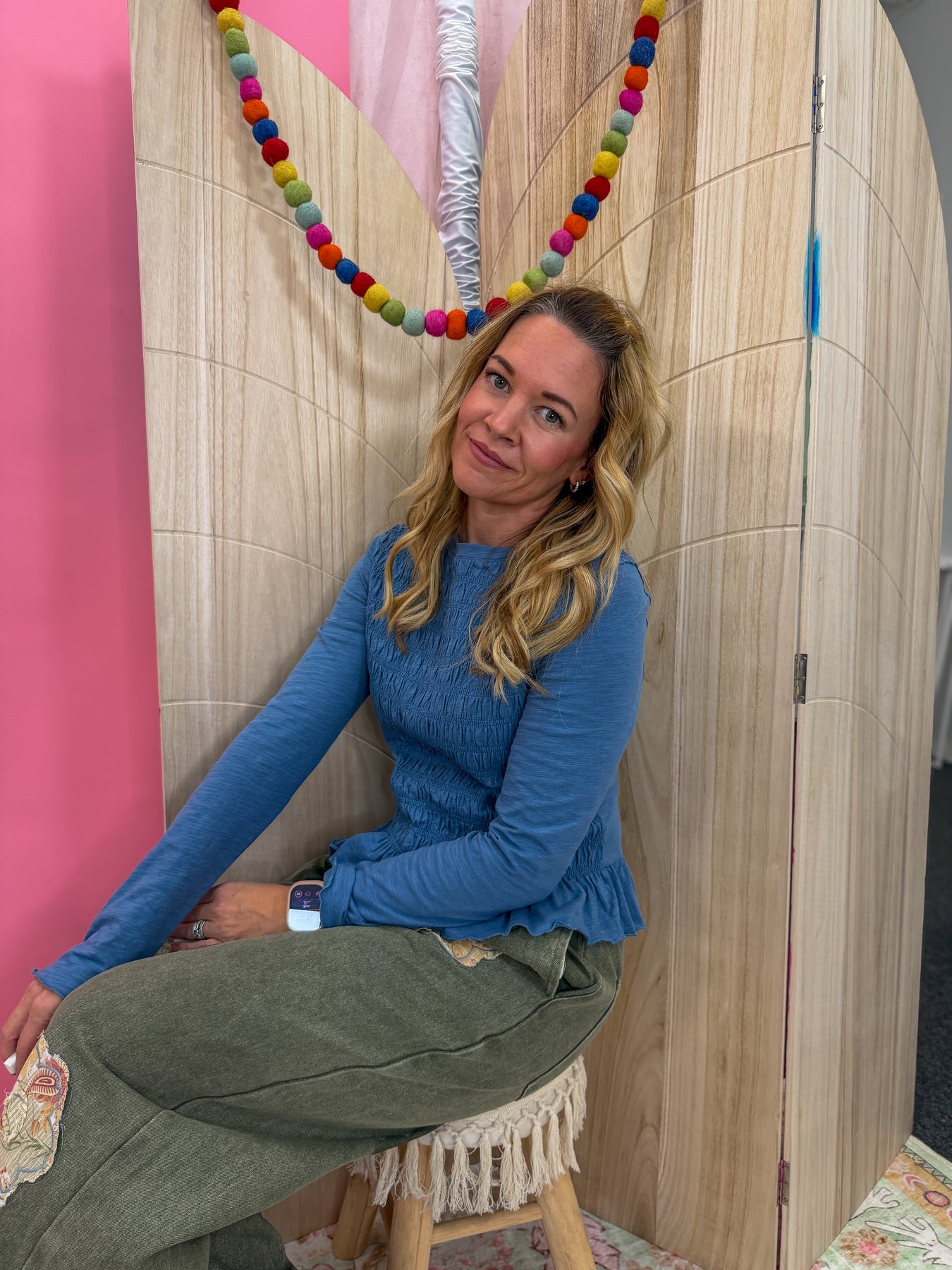 Add a feminine twist to your everyday style with this smocked peplum top. Featuring a flattering smocked bodice, playful ruffle hem, and soft long sleeves, this top balances comfort with effortless charm. The lightweight knit fabric makes it an easy choice for layering or wearing solo through the seasons.