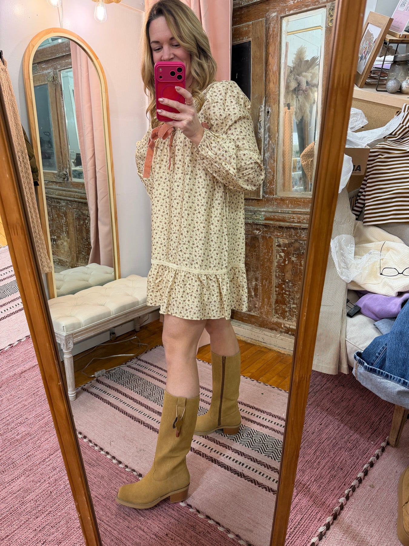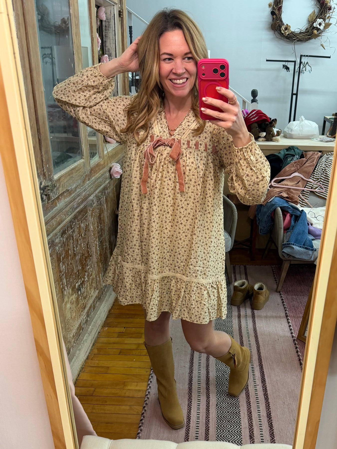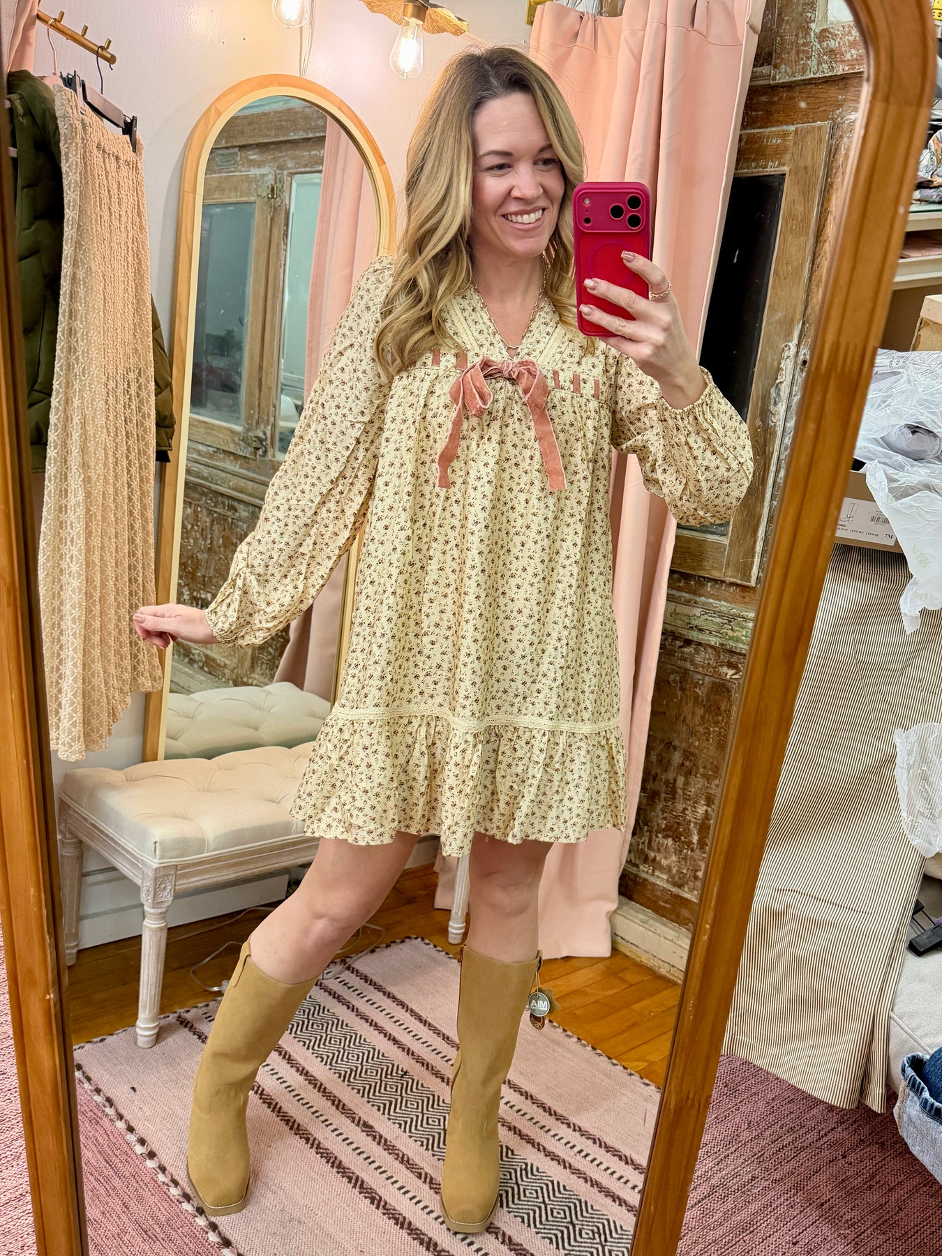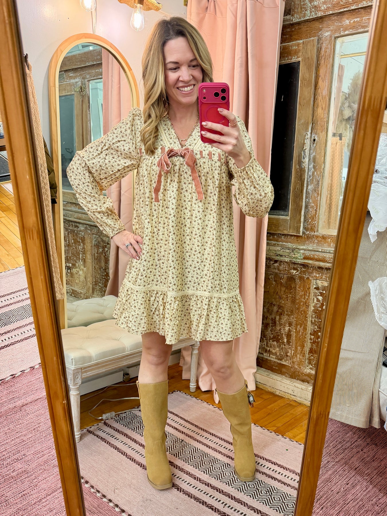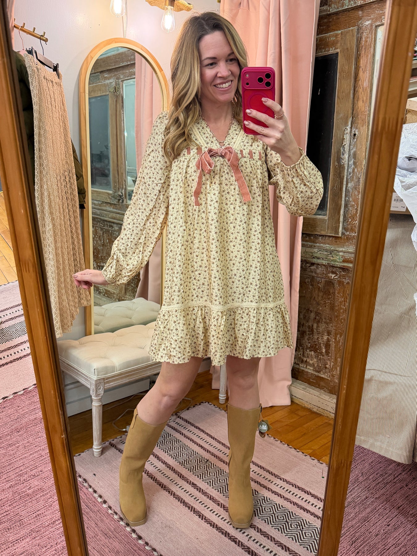 This charming mini dress combines vintage-inspired details with modern flair. The floral print adds a cheerful pop of color, while the front bow creates an adorable focal point. Long sleeves provide coverage and versatility, and the V-neckline offers a flattering silhouette. Delicate crochet trim along the edges brings a handcrafted, feminine touch. Perfect for brunch dates, casual outings, or whenever you want to feel effortlessly cute and put-together.