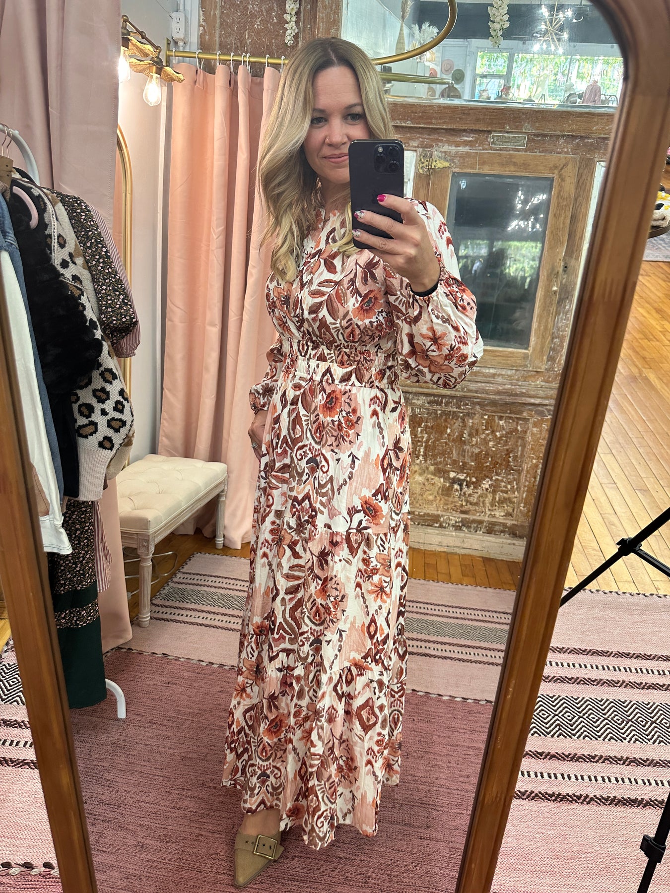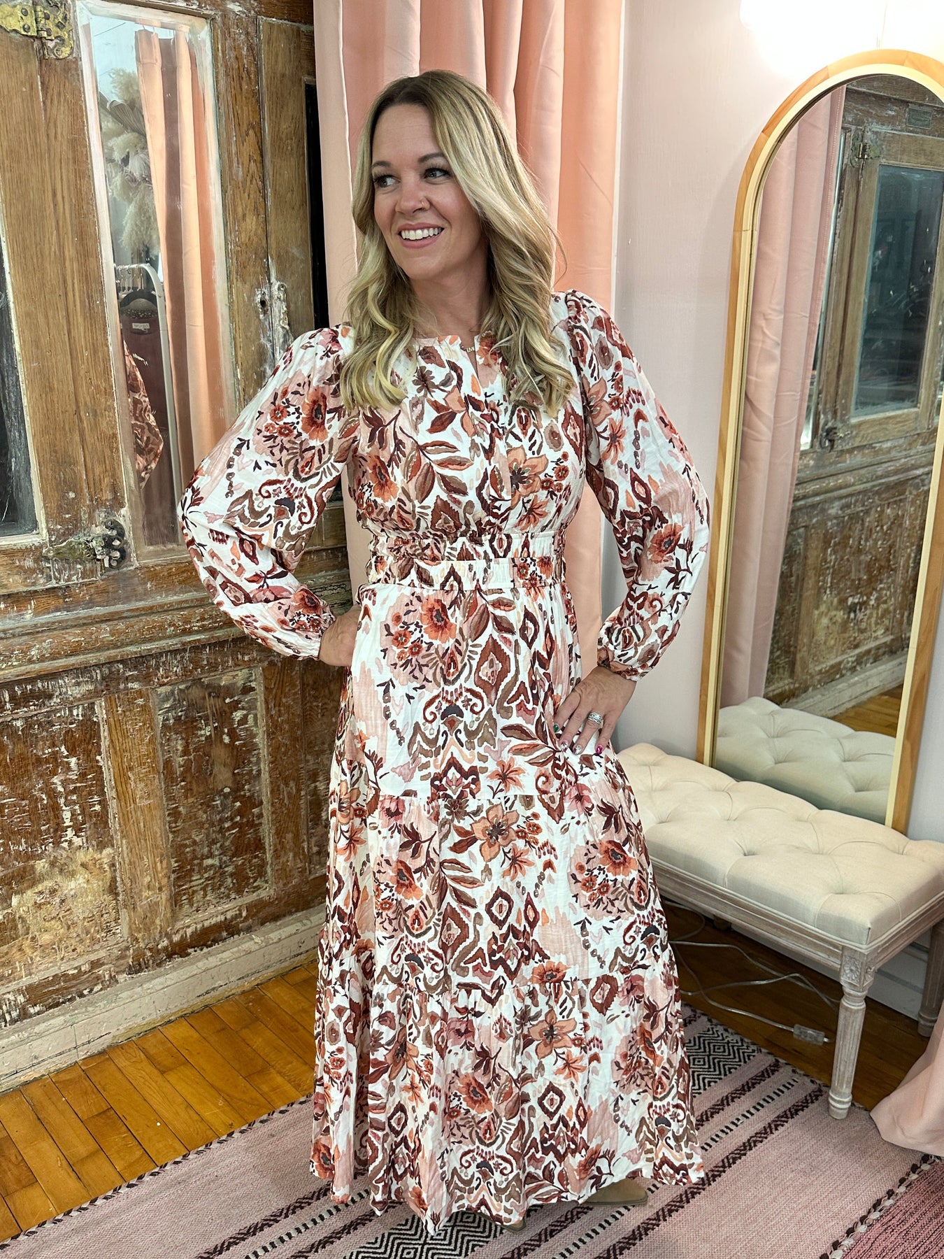 This long sleeve woven maxi dress commands attention with its bold tiered print and flowing silhouette. Fully lined for comfort and featuring convenient pockets, it effortlessly combines style and practicality. Perfect for making a fearless statement wherever you go.