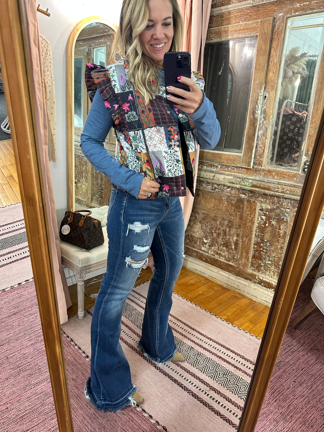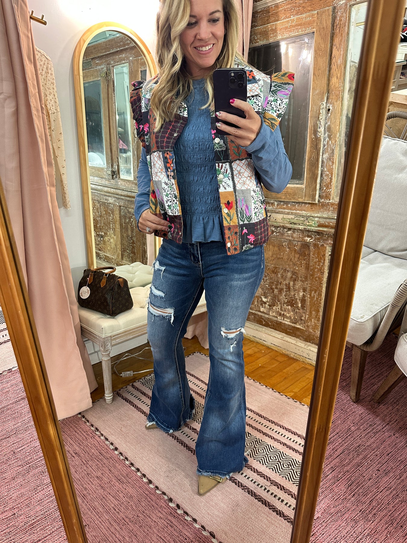 Make a statement with this bold patchwork vest, blending floral, plaid, and embroidered motifs into one eye-catching piece. Designed with structured ruffle-trimmed shoulders, snap button closures, and a slightly boxy silhouette, this vest delivers a modern twist on vintage charm. Its cropped length makes it perfect for layering over sheer tops, knits, or tees—adding instant personality and playfulness to any outfit.