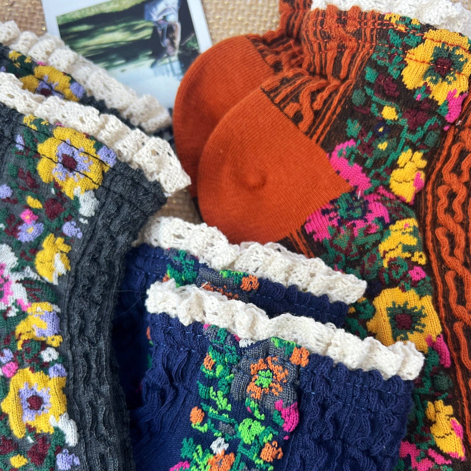 Meet the ankle version of the cutest boot sock favorite you already know and love! These soft and cozy ankle length socks feature adorable floral print sides. They pair beautifully with clogs, sandals, and booties for a touch of retro bohemian flare - that will take you back to the 90's!
