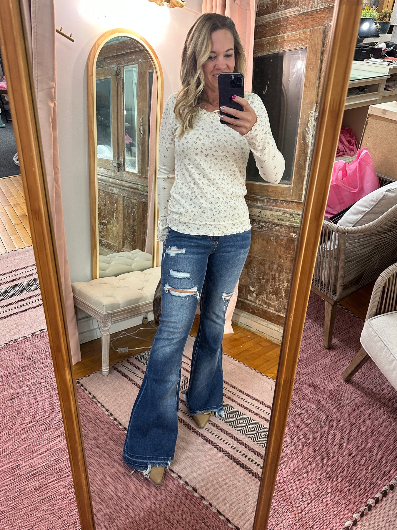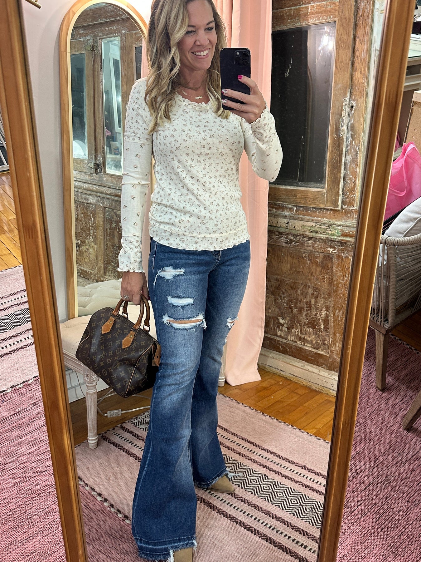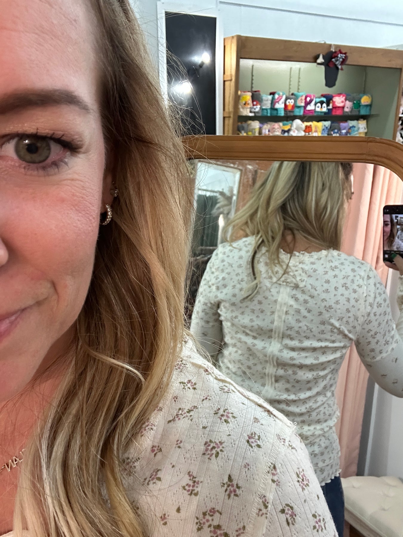 Elevate your wardrobe with this daring floral printed knit top featuring a flattering fitted silhouette. The delicate lettuce hem adds a playful edge, while the round neck and long sleeves create a sleek, confident look perfect for standing out. Embrace bold femininity with every wear.