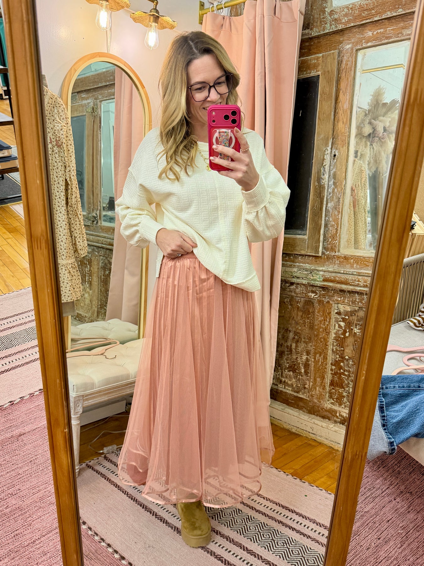 Twirl into the spotlight in this dreamy tulle midi skirt that brings instant romance to your wardrobe. The airy 100% polyester tulle creates a whimsical, ethereal vibe perfect for everything from brunch dates to special occasions. An elastic waistband keeps things comfortable and effortless, while the lined interior (90% polyester, 10% spandex) ensures smooth movement and coverage. At 30" total length, it's perfectly proportioned for petite frames. Layer it over your favorite slip or wear it solo—either way, this skirt is ready to make you feel fabulous and fun.