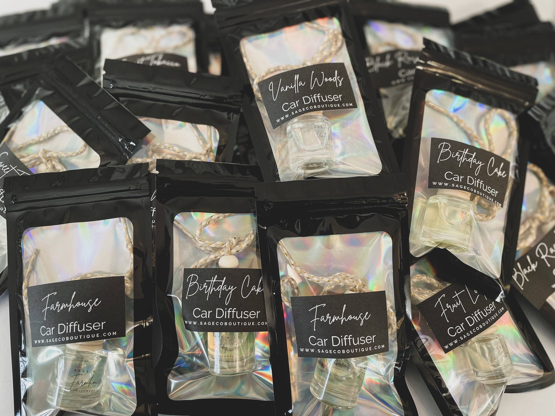 Car Fragrance Diffusers hang from the rear view mirror and release scent whenever turned upside down. Directions for use: 1. Unscrew wooden top and remove plastic stopper. 2. Screw wooden lid back on securely 3. Turn upside down to release fragrance for 2-3 seconds. The wooden top will become saturated with oil. 4. Turn bottle upright and hang to enjoy! Sage & Co is not liable for any damages caused by spilled oil. If you spill any oil wipe away immediately with a cloth. By purchasing this product you release Sage & Co. from any liability. As of July 1st 2023 the bottles will no longer include the clear labels. The bottles have changed and we can’t find any clear labels that will stay attached to the bottles.